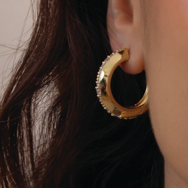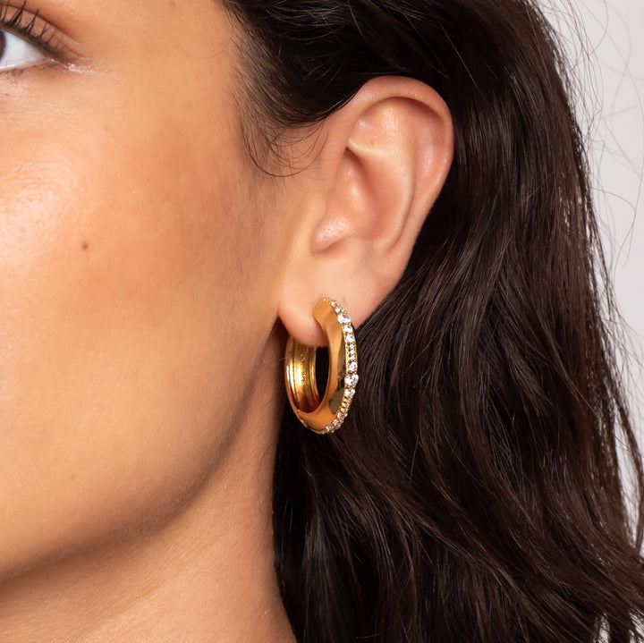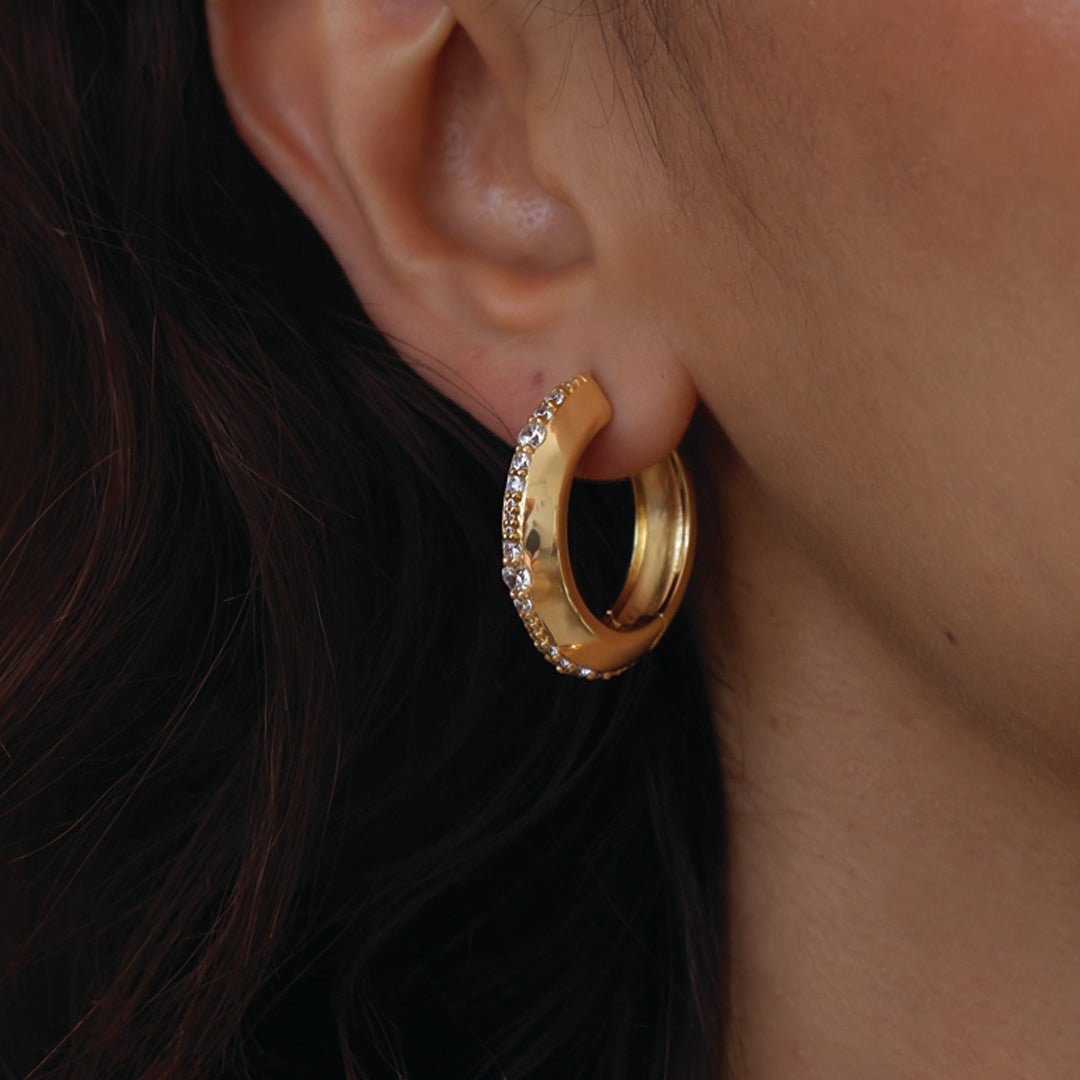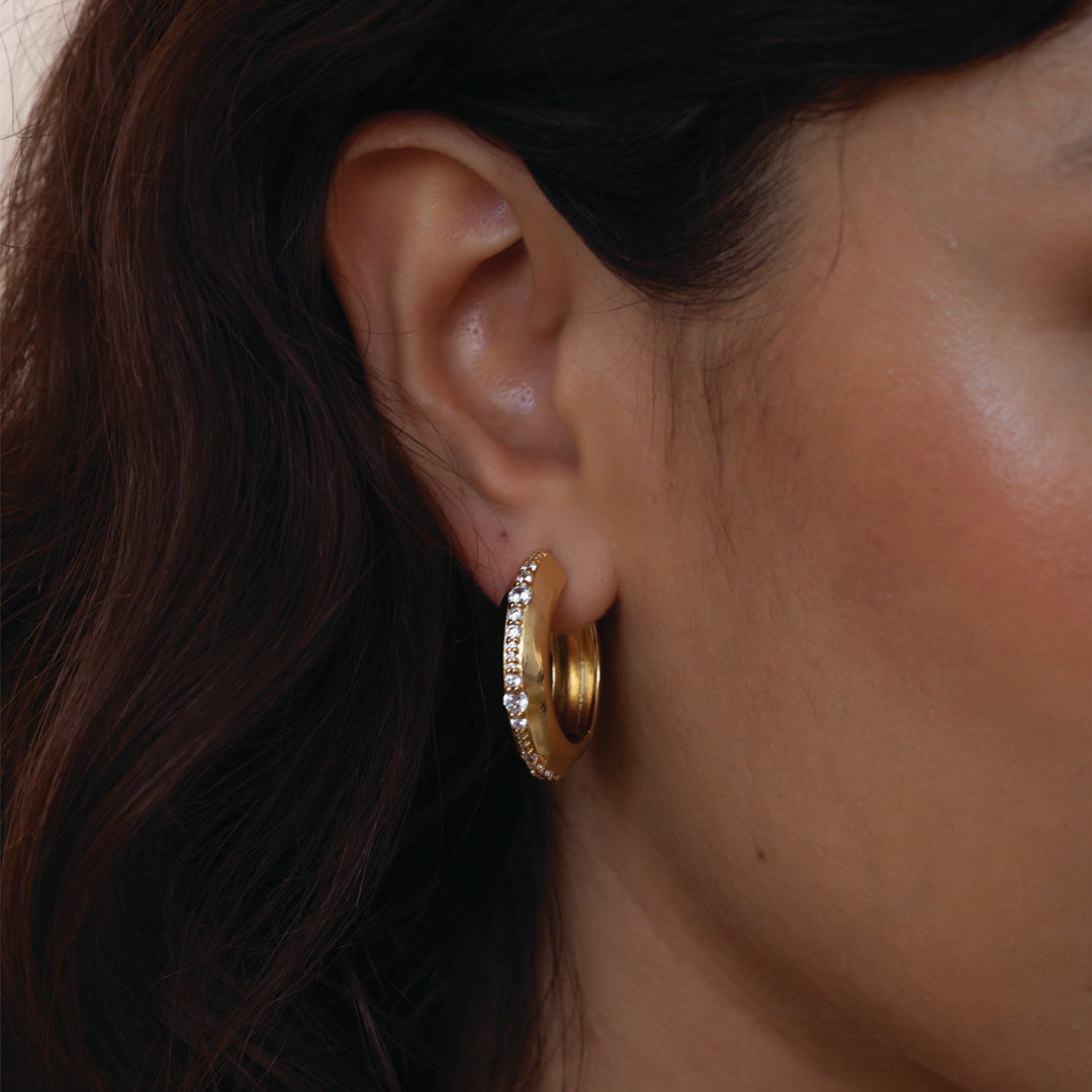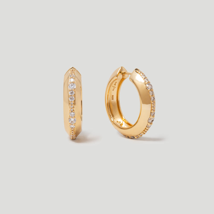 These knife edge gold hoop earrings have subtle pave details with a unique mix of cubic zirconia stones through the centre.