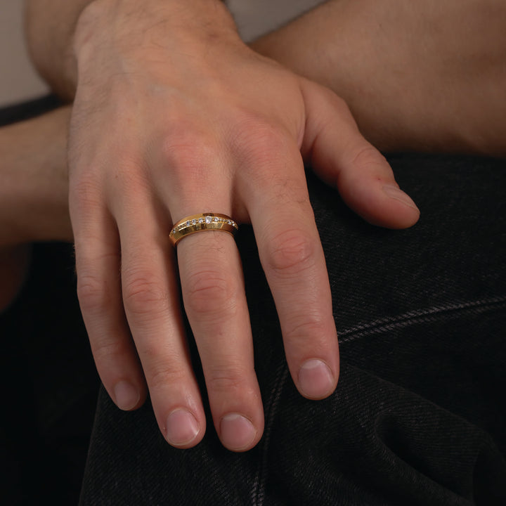 The sleek knife edge sides graduate to a point to perfectly frame the CZ pave stones running along the centre of the gold ring band.