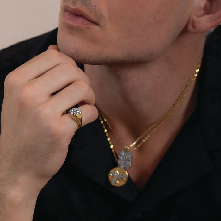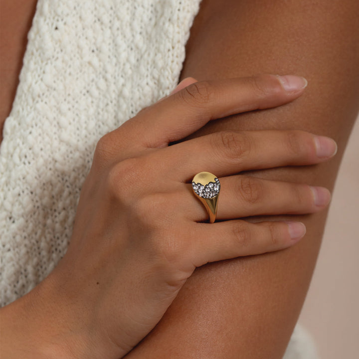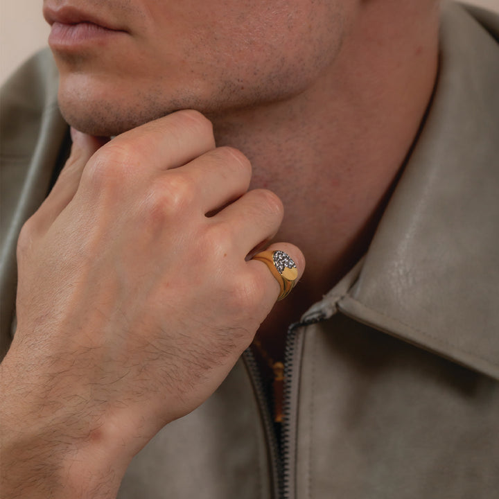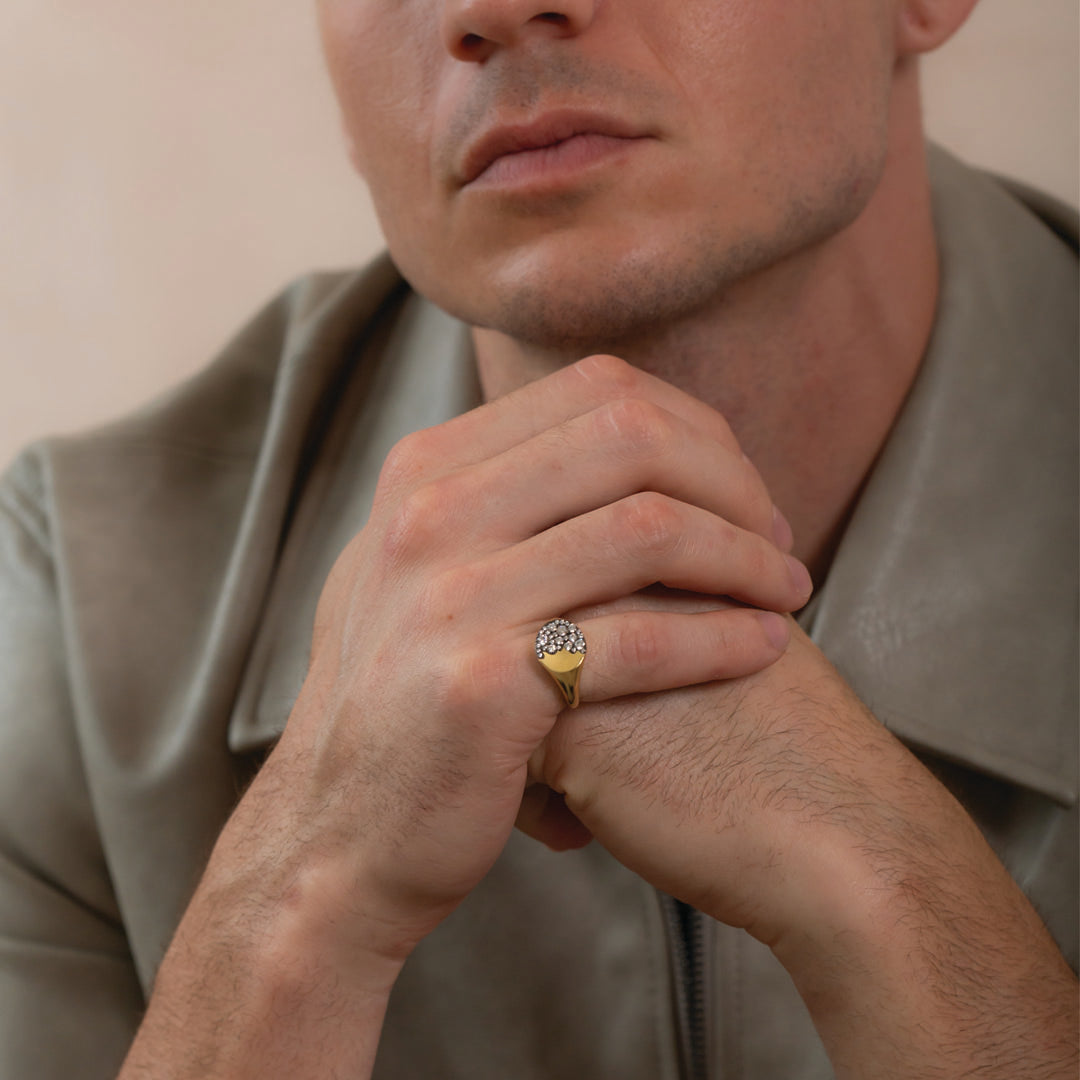 With a concave ring face and unique crystal details, this classic gold signet ring has a modern twist, inspired by natural geode crystals.