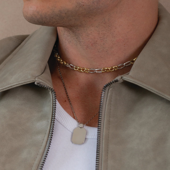 Handcrafted from recycled sterling silver, this unique silver and gold chain choker necklace is the perfect piece to style with longer mens chains or gold chain necklaces for women.