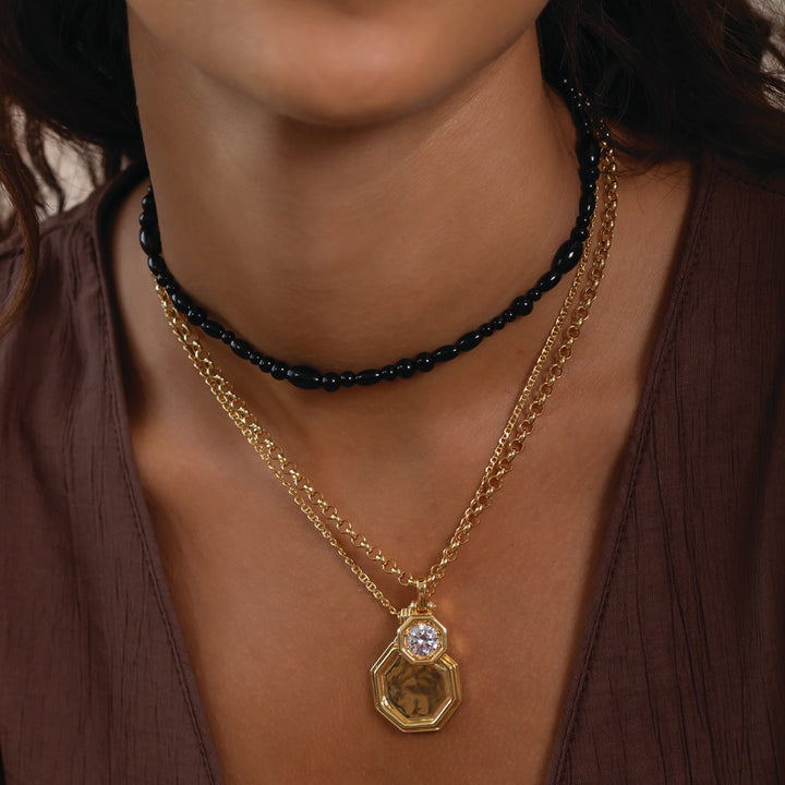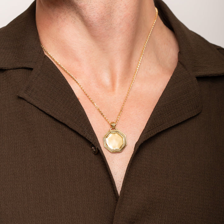Our signature gold coin necklace featuring an octagon pendant with ridged domed details on the boarder & the bale.