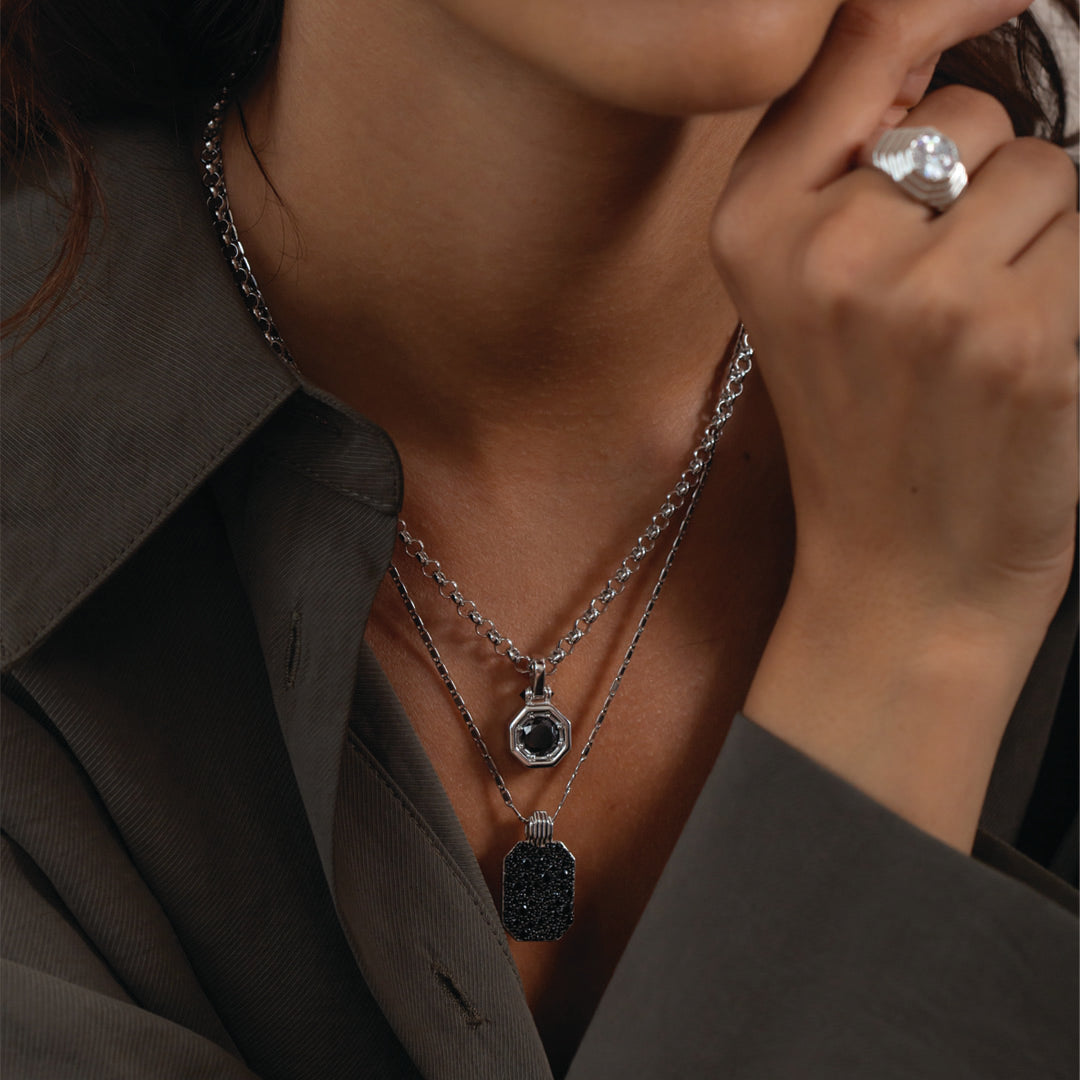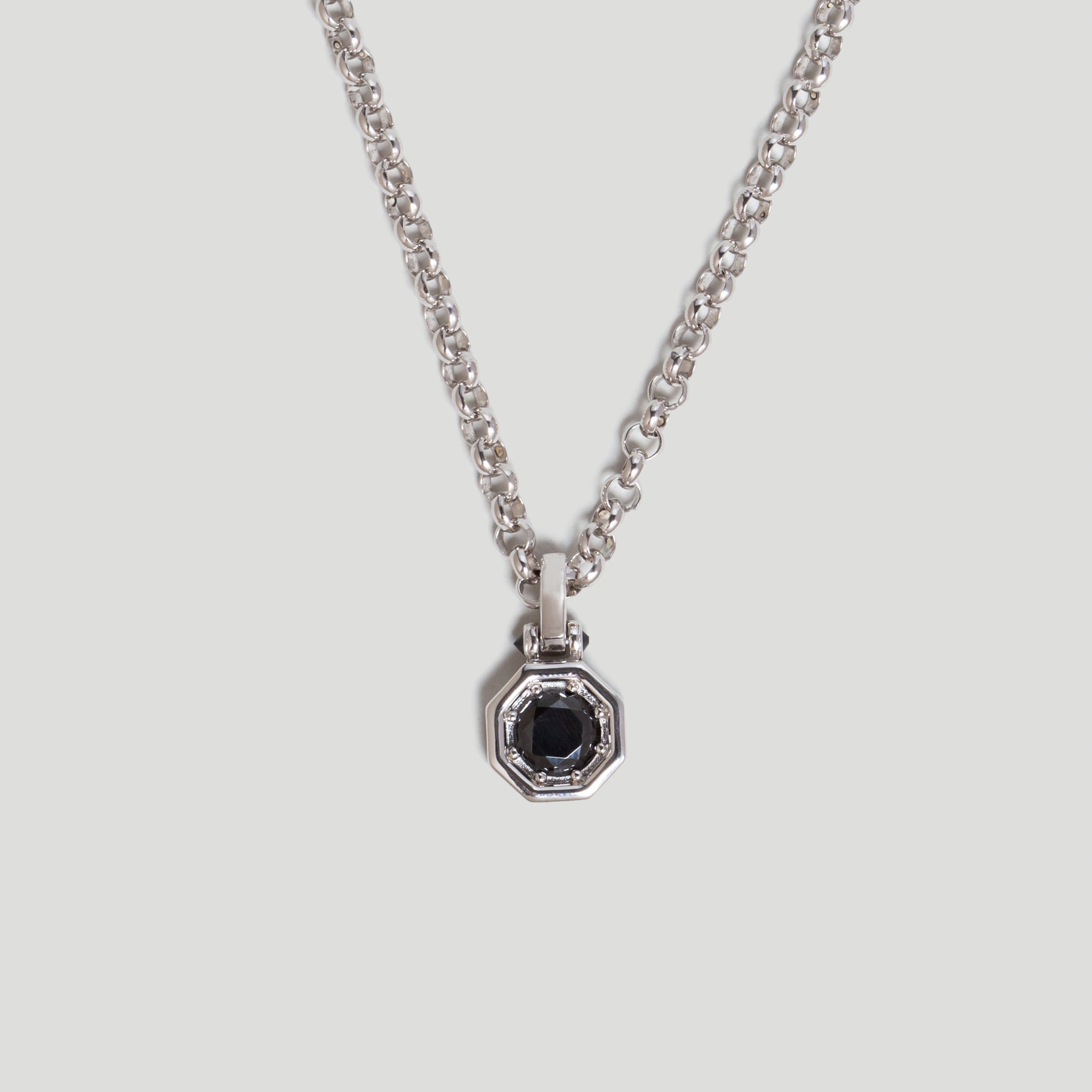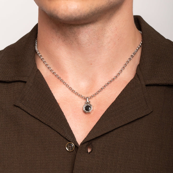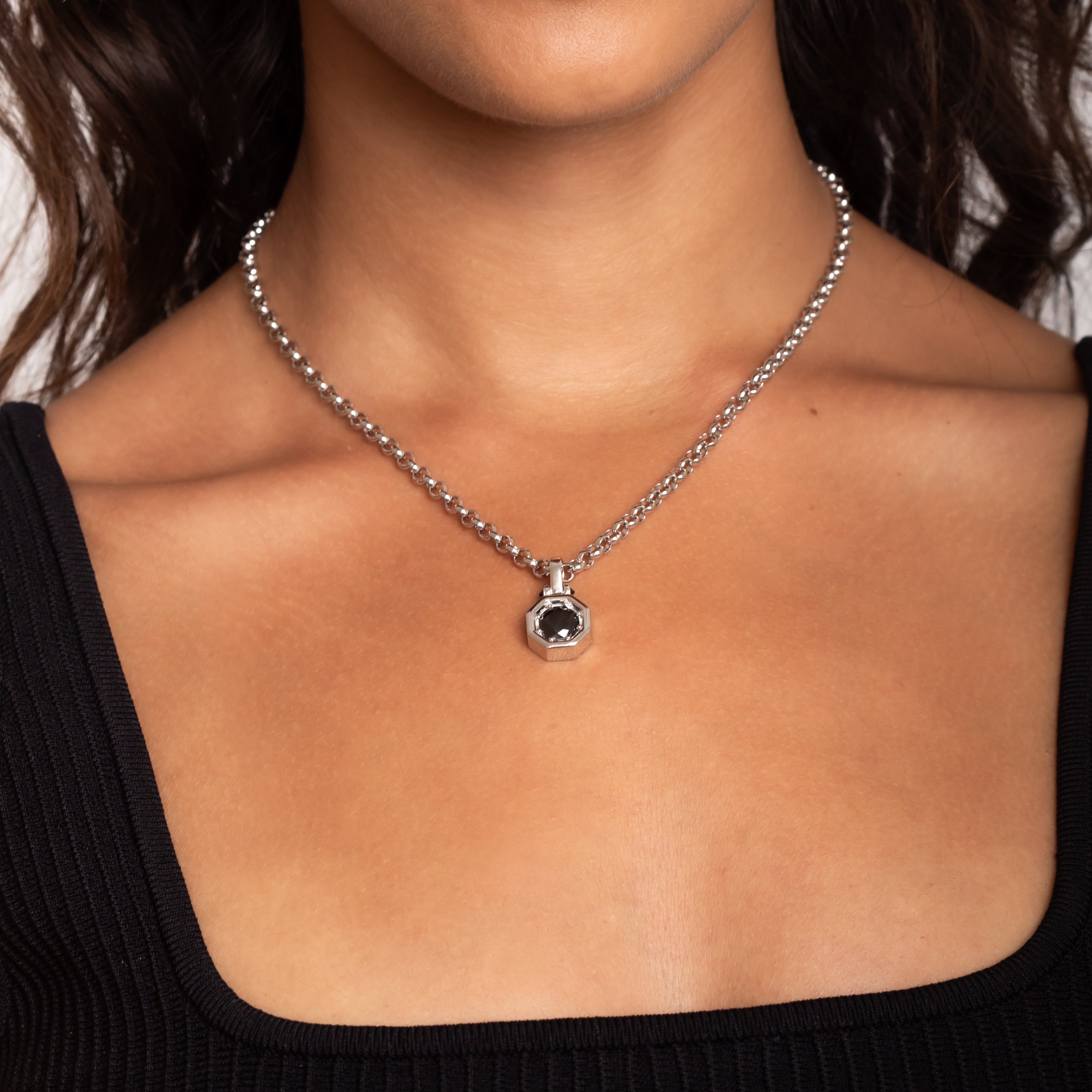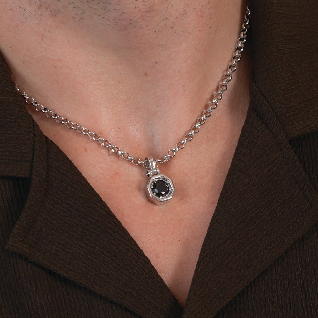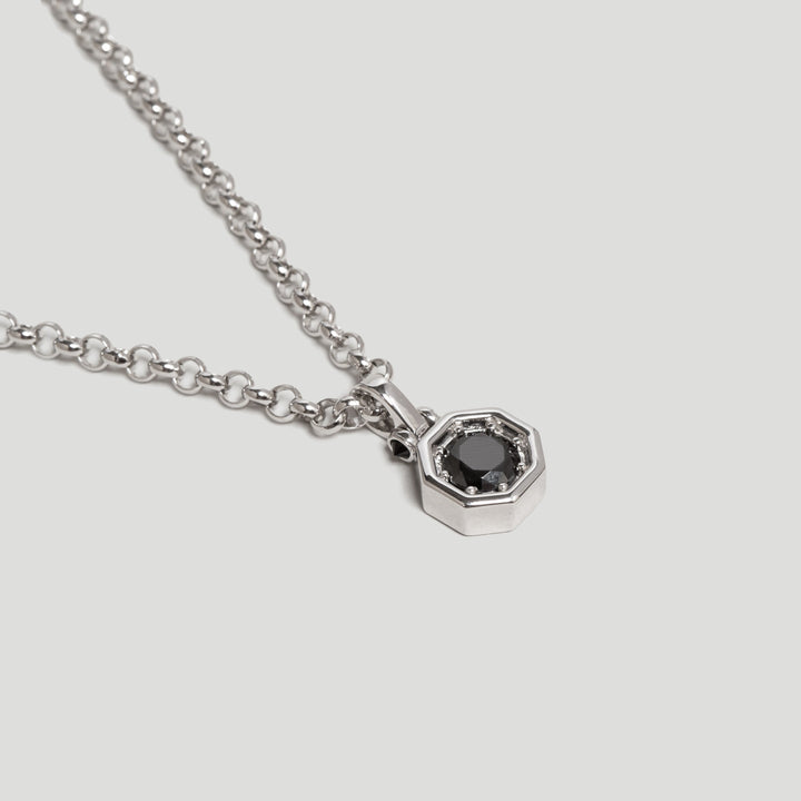 Silver Octagon Pendant Necklace with Black Spinel Stone in Rhodium Plated Sterling Silver