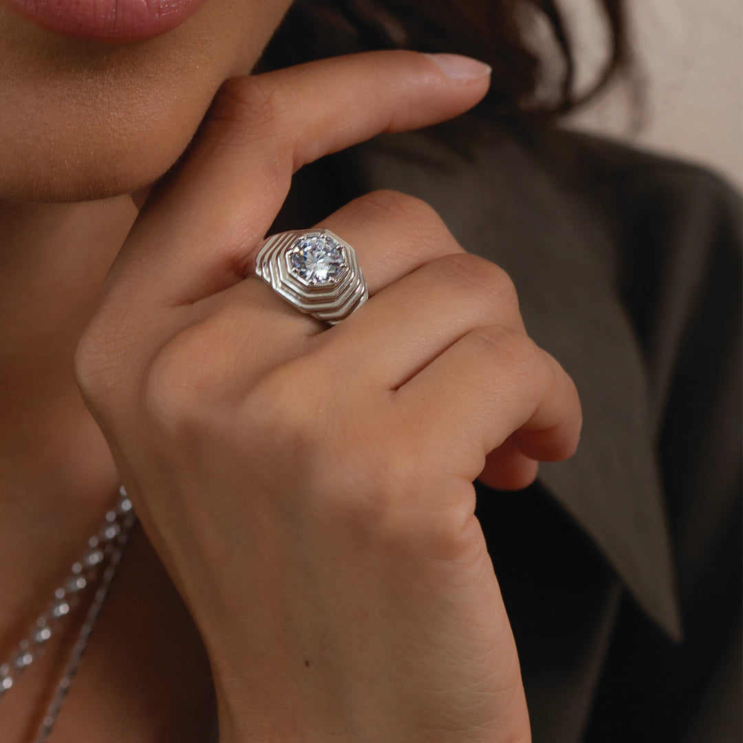 Our signature octagon sterling silver ring has rippled layers framing the cubic zirconia stone setting & graduating seamlessly into the ring band.