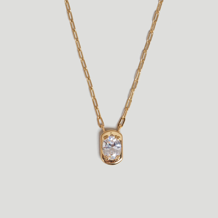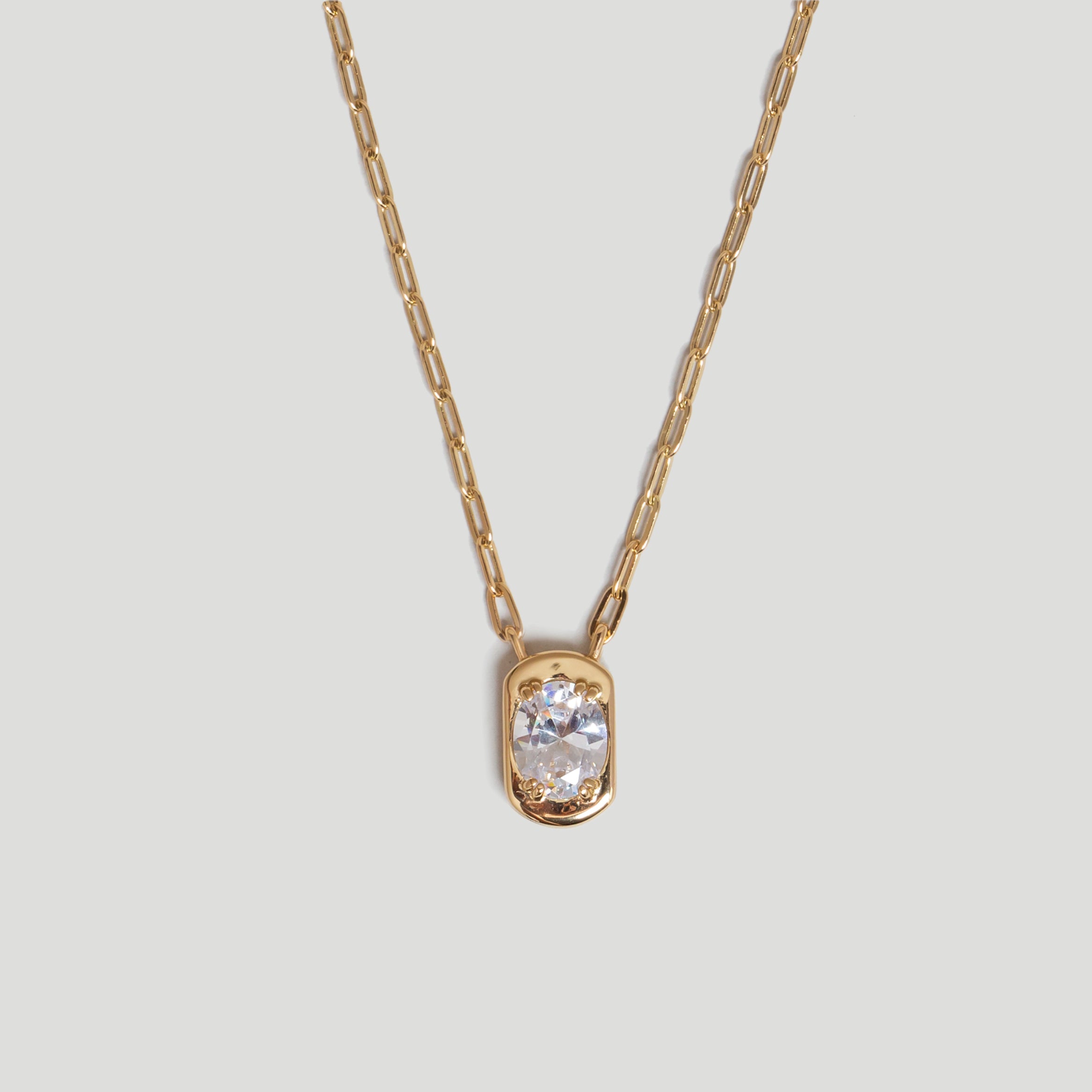 This oval cubic zirconia stone gold pendant necklace has a delicate paperclip chain & double claw detail.