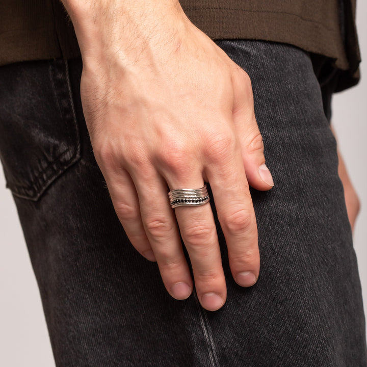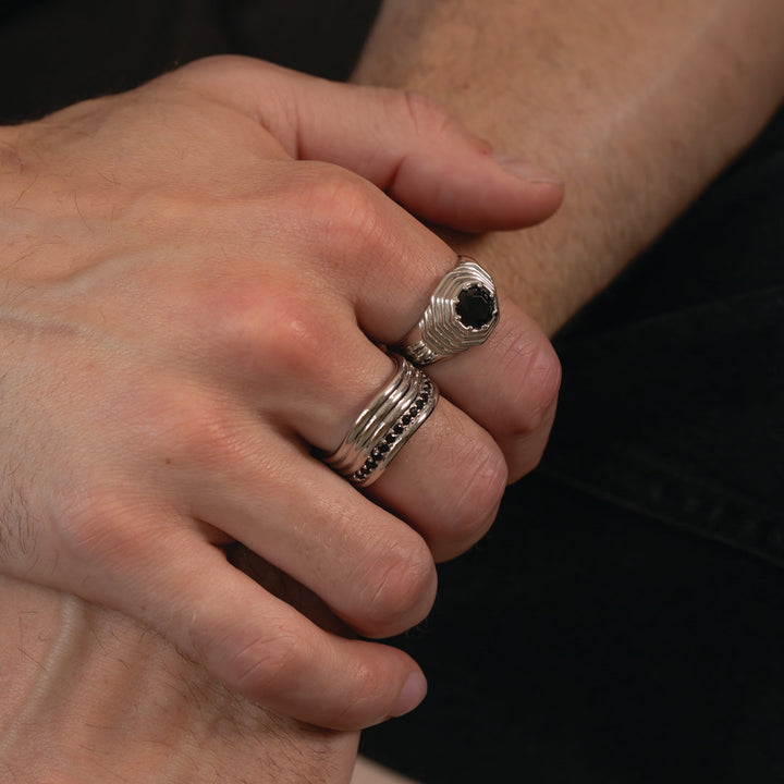 Handcrafted with recycled sterling silver & rhodium plating for extra durability, this chunky sterling silver ring also features black spinel stones.