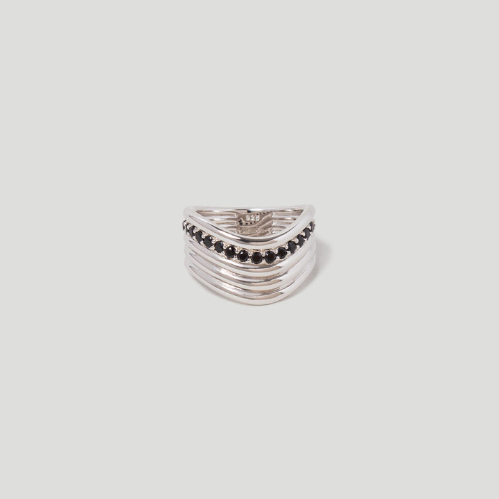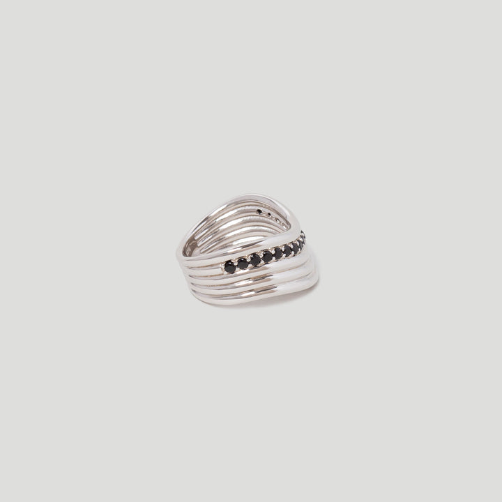 Wave Black Spinel Stone Chunky Silver Ring in Rhodium Plated Sterling Silver