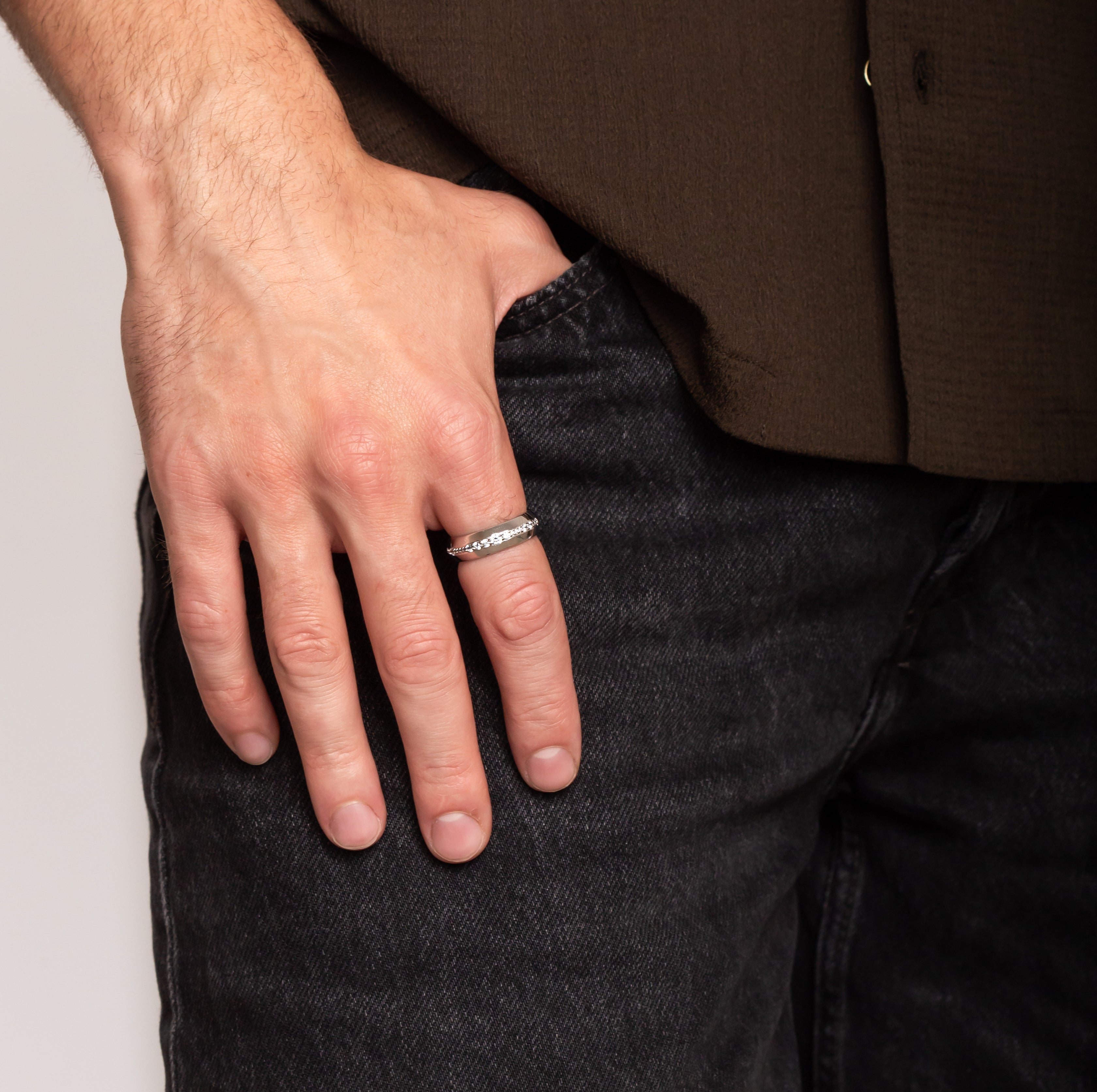 The sleek knife edge sides graduate to a point to perfectly frame the CZ pave stones running along the centre of the silver ring band.