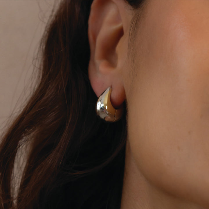 Our teardrop silver hoop earrings have delicate 18 carat gold details and a domed design that catches the eye from every angle.