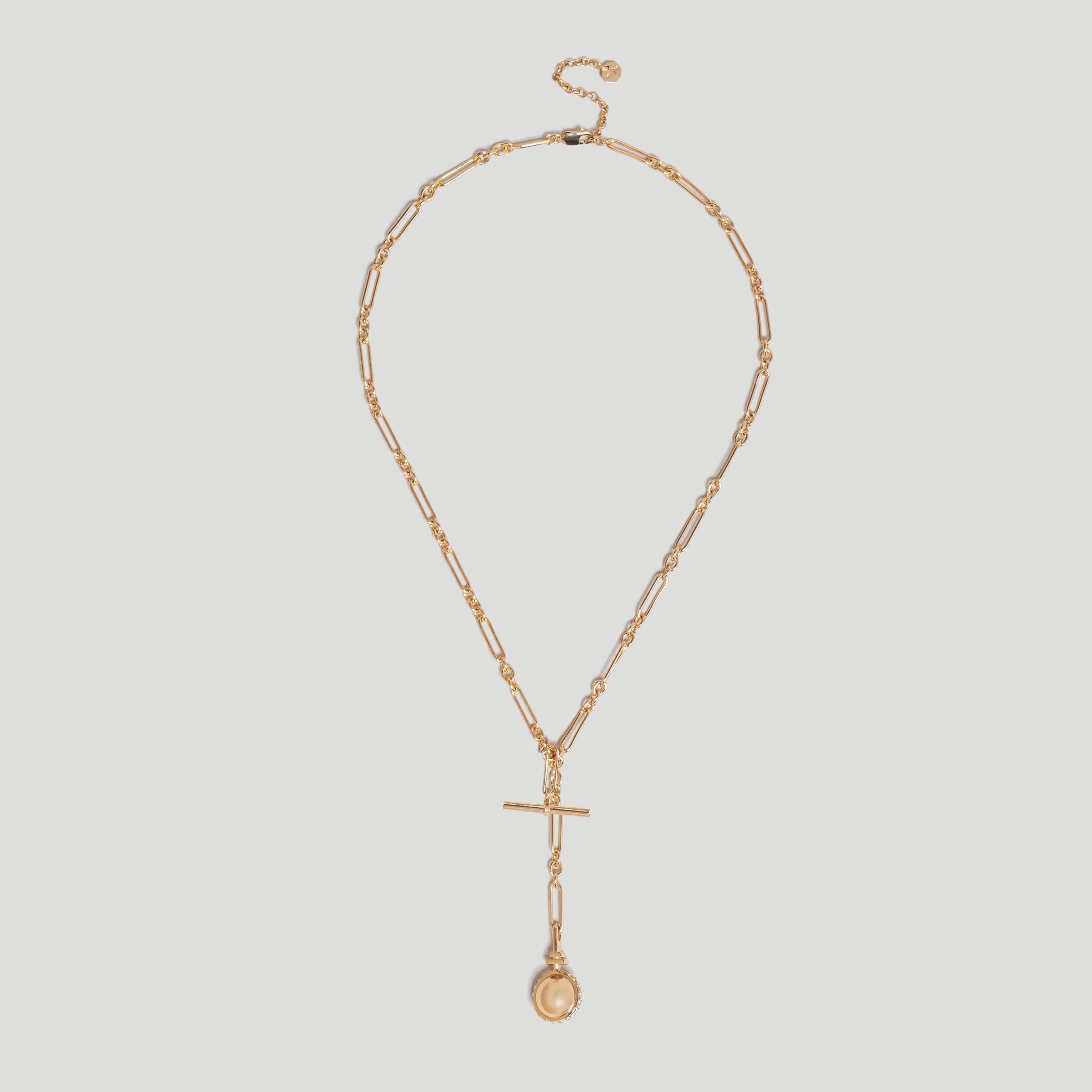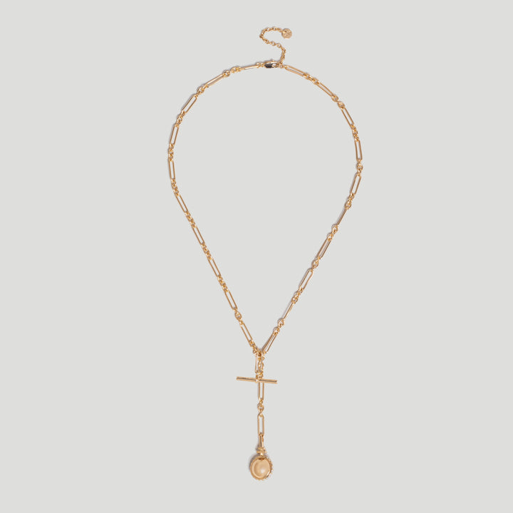 This mixed link gold chain necklace features a classic T bar & orb pendant with subtle cubic zirconia crystal details.